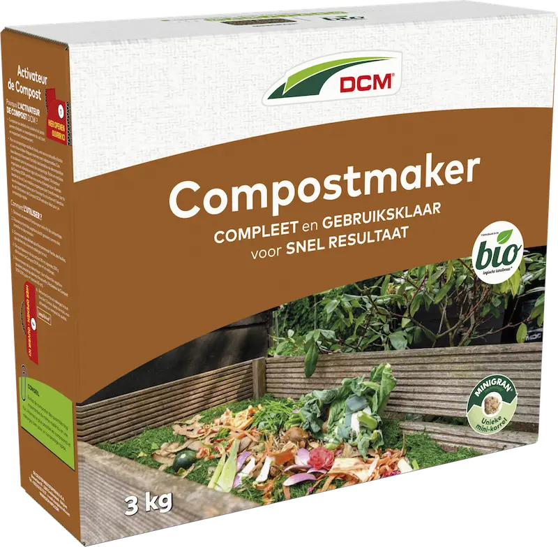 DCM Compostmaker is een alles-in-één pakket op basis van fossiele zeewierDCM kalk, meel en perliet en een organische stikstofbron. Voor een snelle en geslaagde compostering zijn een natuurlijke stikstofbron en zeewierDCM kalk, meel en perliet onmisbaar. Deze bevorderen de activiteit van de composterende bacteriën en versnellen zo het composteringsproces. DCM Compostmaker, rijk aan organische stof, is toepasbaar in de biotuin en is een energiebron voor talrijke bodembacteriën. De organische stof wordt door het microbieel leven omgezet in humus die de structuur en de doorlaatbaarheid bevordert. DCM Compostmaker vormt zo het ideale hulpmiddel voor een snelle compostering.