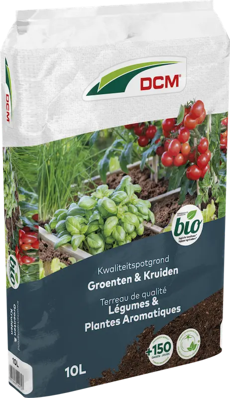 DCM DCM potgrond Groenten & Kruiden heeft een aangepaste samenstelling voor het kweken van groenten en kruiden in potten of in vierkantemeterbakken. De DCM potgrond geeft maarliefst 150 dagen lang voeding af. Het toegevoegde lavameel is rijk aan natuurlijke mineralen en sporenelementen en vormt zo een bron van plantenvitamines voor sterke en gezonde planten met een goede oogst. Daarnaast wordt het bodemleven verrijkt door de toegevoegde compost. Een actief bodemleven is belangrijk voor de goede groei van planten. Schorscompost maakt de DCM potgrond extra luchtig en houdt water optimaal vast, ideaal voor een goede groei. Toepasbaar in de biotuin.