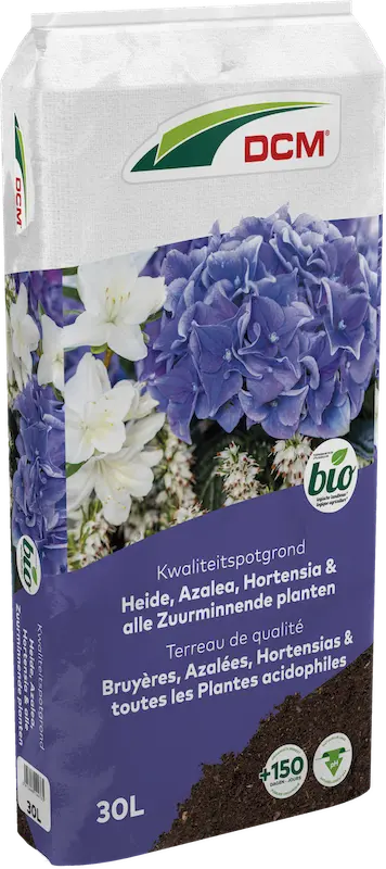DCM potgrond met natuurlijke lage zuurtegraad (pH) ideaal voor zuurminnende planten zoals heide, azalea, rododendron, skimmia, blauwe hortensia, pieris, camelia, pernettya, calluna, gaultheria en vele planten van Japanse oorsprong. De toevoeging van ijzer zorgt voor een diepgroene kleur van de bladeren. Met organische voeding tot 150 dagen. Toepasbaar in de biotuin.