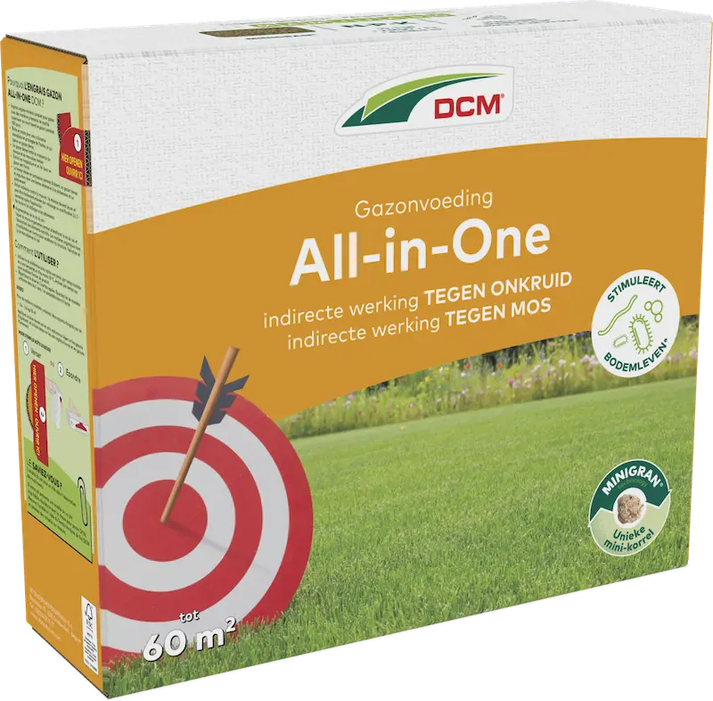 ijzer voor een intens diepgroene graskleur. Het hoge gehalte aan kalium zorgt voor een sterke en dichte grasmat die goed bestand is tegen droogte en betreding. Indirecte werking tegen mos: het mos verkleurt geleidelijk aan geel en kan gemakkelijk na 2 à 3 weken verwijderd worden door uitkammen of verticuteren. Het maakt geen vlekken op tegels of kleding. De toegevoegde micro-organismen zorgen voor meer bodemleven en een betere opname van voedingselementen. De organische stof wordt door het bodemleven omgezet in humus die de structuur, de doorlaatbaarheid en het microbieel leven van de grond verbetert. Een bijkomend voordeel van DCM Gazonvoeding All-in-One is dat deze zowel in het voorjaar, zomer als in de herfst te gebruiken is.