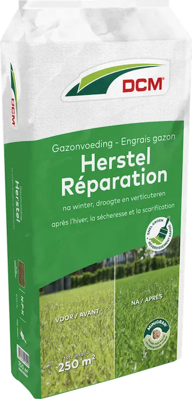 DCM Gazonvoeding Herstel is een herstellende organisch-minerale gazonmeststof met hoogkwalitatieve grondstoffen die 100 dagen voeding geven aan het gazon. Ideaal voor herstel van verzwakte gazons zoals vergeelde gazons na de winterperiode, gazons na het verticuteren, na droogteperiodes, bij het inzaaien van kale plekken of bij algemene doorzaai. De voeding is verrijkt met ijzer voor een snel groeneffect. Het geeft direct resultaat én een lange nawerking door de combinatie van minerale en organische bestanddelen.