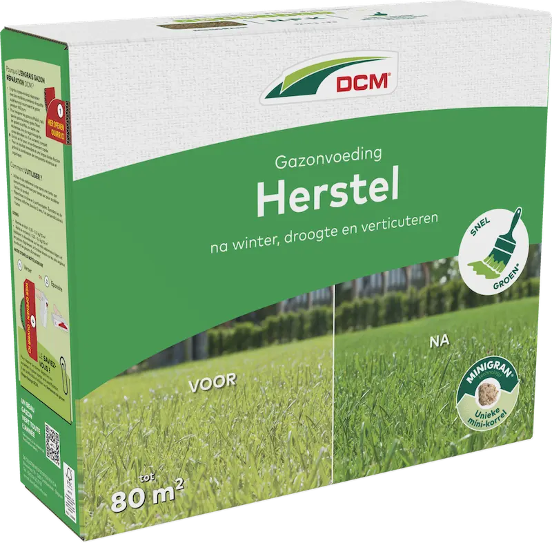 DCM Gazonvoeding Herstel is een herstellende organisch-minerale gazonmeststof met hoogkwalitatieve grondstoffen die 100 dagen voeding geven aan het gazon. Ideaal voor herstel van verzwakte gazons zoals vergeelde gazons na de winterperiode, gazons na het verticuteren, na droogteperiodes, bij het inzaaien van kale plekken of bij algemene doorzaai. De voeding is verrijkt met ijzer voor een snel groeneffect. Het geeft direct resultaat én een lange nawerking door de combinatie van minerale en organische bestanddelen.