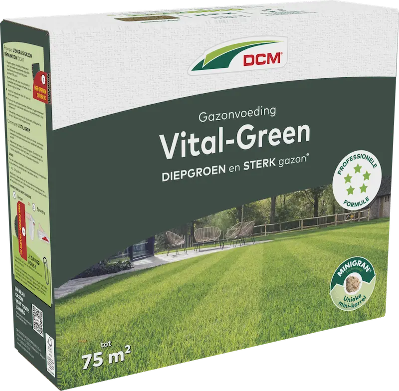 DCM Gazonvoeding Vital-Green is uitgevoerd in MINIGRAN® korrels. Ieder korreltje bevat vele hoogwaardige ingrediënten die zorgen voor een gelijkmatige afgifte van de voedingsstoffen, wel 100 dagen lang. Het kleine formaat van de korrels zorgt bovendien voor een betere verdeling.