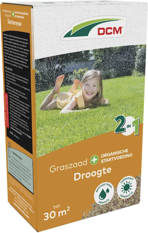 DCM Graszaad 2-in-1 Droogte is een professionele kwaliteit graszaad met organische startvoeding. Het is een mengsel van sterke, diep wortelende grassoorten die bestand zijn tegen hitte en droogte. Speciaal ontwikkeld voor droogtegevoelige zandgronden, hellingen of verhoogde tuinen. Door de diepe beworteling is de behoefte aan water aanzienlijk kleiner. Ook groeit de grasmat snel dicht, waardoor onkruiden minder kans maken. Er is extra organische startvoeding toegevoegd voor een nog snellere inworteling. Het graszaad is van topkwaliteit, geschikt voor elke grondsoort - ook droogtegevoelige zandgronden - en zit in een handige strooidoos, voor een gelijkmatige verdeling. Dosering 350 gram per 10 m².