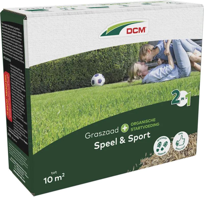 DCM Graszaad 2-in-1 Speel & Sport is een professionele kwaliteit graszaad met organische startvoeding. Het is geschikt voor het inzaaien van een nieuw speel- en sportgazon en geeft een ijzersterke grasmat. Blijft mooi vol, zelfs bij intensief gebruik. Het graszaad kiemt snel, ook bij lagere temperaturen. Er is extra organische startvoeding toegevoegd voor een nog snellere inworteling. De grasmat groeit snel dicht, waardoor onkruiden minder kans maken. Het graszaad is van topkwaliteit, geschikt voor elke grondsoort en zit in een handige strooidoos, voor een gelijkmatige verdeling. Dit graszaadmengsel is ook wel bekend onder de naam DCM Activo® Plus. Dosering 200 gram per 10 m².