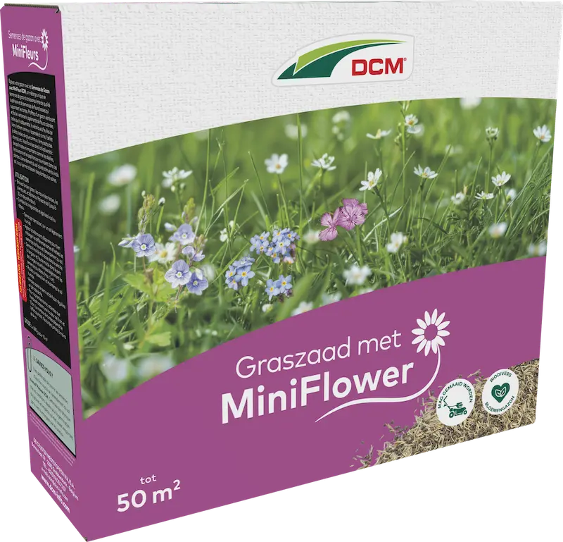 Vrolijk je gazon op met DCM Graszaad met MiniFlower, een unieke mix van hoogwaardig graszaad en laagblijvende bloemenzaden die speciaal zijn geselecteerd om gemaaid te worden. Geniet van een weelderige en onderhoudsvriendelijke groene grasmat met kleurrijke bloemen zoals madeliefje, klimopereprijs,echte tijm, hoornviooltje, steenanjer, reigersbek, akkervergeet-me-nietje, …. Zo steun je de biodiversiteit: belangrijke bestuivers zoals bijen, hommels en vlinders vinden voedsel in deze planten. De toegevoegde bodemverbeteraar stimuleert het bodemleven, wat zorgt voor gezondere planten.
