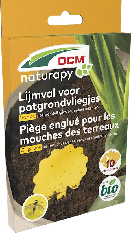 De DCM Lijmval voor DCM potgrondvliegjes is perfect voor het vangen en monitoren van DCM potgrondvliegjes (varenrouwmuggen), bladluizen, witte vlieg en andere schadelijke insecten bij kamerplanten. De verpakking bevat 10 lijmvallen die je eenvoudig in de DCM potgrond bij je kamerplanten steekt. De lijmvallen zijn geurloos en gifvrij. De gele kleur trekt insecten aan, terwijl de speciale lijm ze vangt.