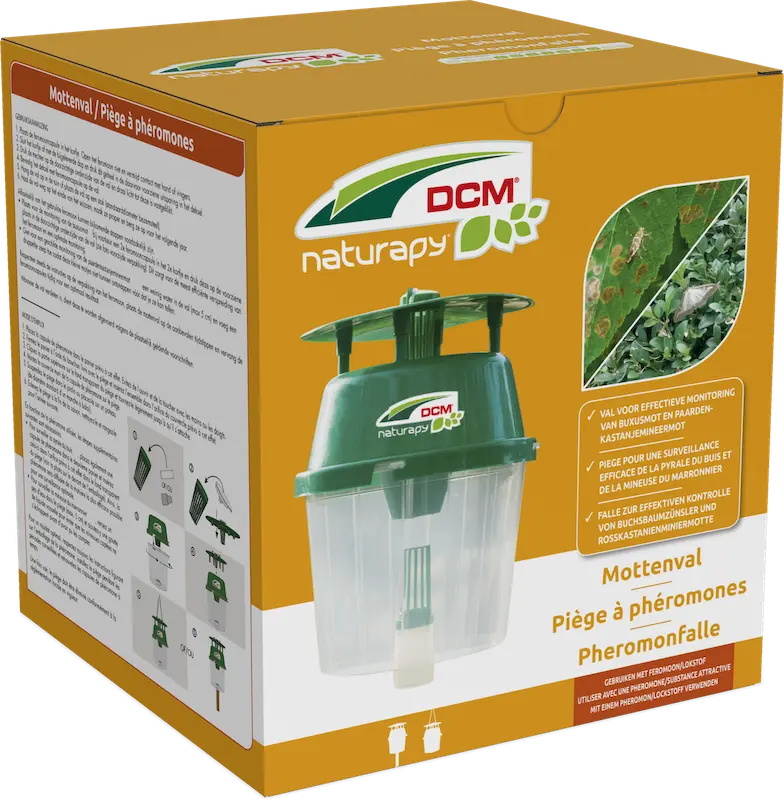 DCM Mottenval is een unieke val speciaal ontworpen om, in combinatie met het juiste DCM feromoon, specifieke motten te vangen voor monitoring, bv. de buxusmot of paardenkastanjemineermot. Deze val is snel en eenvoudig monteerbaar en is dankzij zijn robuust en weersbestendig ontwerp verschillende jaren bruikbaar.