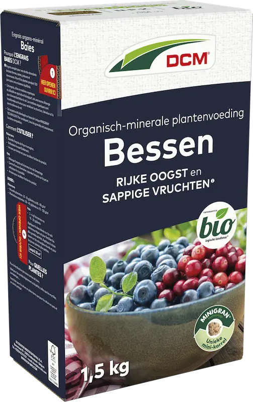 DCM Plantenvoeding Bessen is een complete meststof op basis van natuurlijke grondstoffen voor een rijke oogst van stevige, gezonde, sappige en smaakvolle bessen. Zeer geschikt voor licht zuurminnende bessensoorten. Toepasbaar in de biotuin.