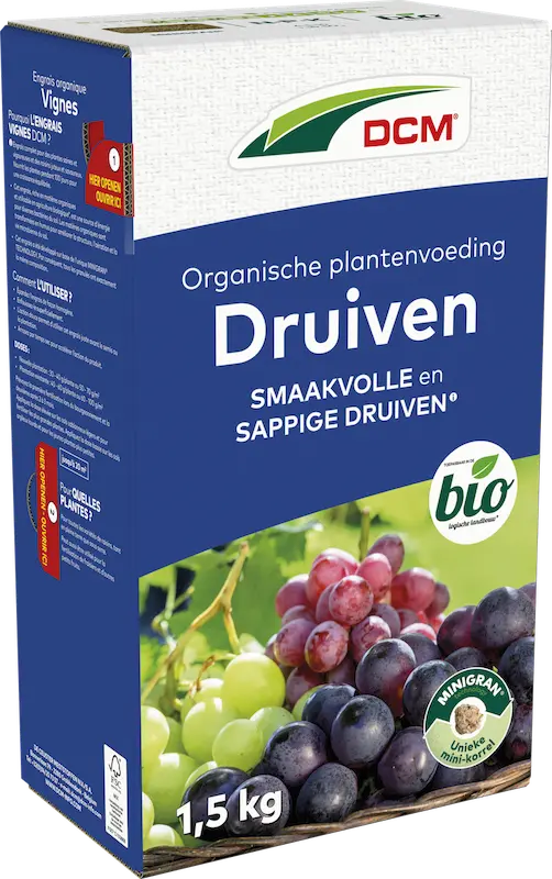 DCM Plantenvoeding Druiven is een organische meststof met voldoende stikstof en zwavel voor een goede groei van druivenstruiken. Daarnaast bevat het fosfor en kalium voor een rijke opbrengst. Toepasbaar in de biotuin.