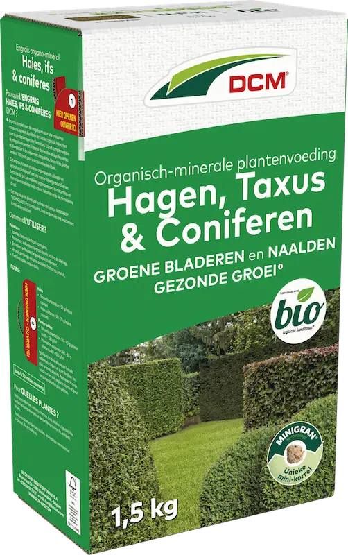 DCM Plantenvoeding Hagen, Taxus & Coniferen is specifiek afgestemd op de voedingsbehoeften van coniferen, naaldbomen, sparren, taxus en hagen. Het toegevoegde magnesium is belangrijk om bruinverkleuring van naalden tegen te gaan. Zorgt voor een evenwichtige groei. Toepasbaar in de biotuin.