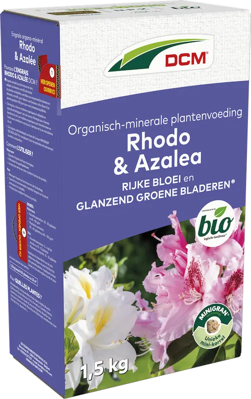 DCM Plantenvoeding Rhodo & Azalea bevat een specifieke samenstelling voor het bemesten van zuurminnende planten zoals azalea, rododendron, blauwe hortensia, skimmia, heide, camelia, etc. Extra magnesium en ijzer zorgen voor glanzende en groene bladeren. Toepasbaar in de biotuin.