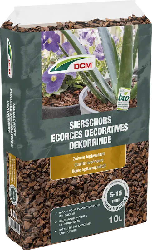 Zeer fijne stukjes schors met bruinrode kleur, uitgezeefd op fractie 5-15 mm. DCM Sierschors is ideaal als afdekmateriaal voor plantenschalen, bloembakken of potten. Het voorkomt uitdroging van de DCM potgrond en voorkomt als fysische barrière ook onkruidgroei op potten. Strooi een laag van 2 - 3 cm dik.