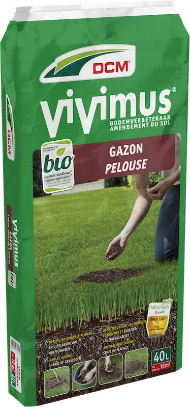 DCM Vivimus® Gazon is een bodemverbeteraar voor het herstellen of aanleggen van gazon. Meng het met graszaad voor een snel herstel van kale plekken en een beter resultaat bij doorzaaien. Gebruik het voor het uitvlakken van molshopen of putten in gazons of om te mengen in de grond bij de aanleg van een nieuw gazon. DCM Vivimus® Gazon is verrijkt met organische meststof waarin goede bacteriën gemengd zijn en stimuleert het bodemleven. Toepasbaar in de biotuin.