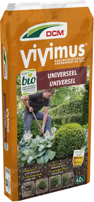 DCM Vivimus® Universeel is een organisch bodemverbeterend middel dat het aanwezige bodemleven stimuleert waardoor de planten snel en vlot inwortelen en een betere groeistart hebben. Je gebruikt het bij het aanplanten van bomen, struiken en planten in je tuin en mengt het met de bestaande grond. Het gegarandeerde resultaat van DCM Vivimus® is een stevige en sterke inworteling en dus een gezonde, vlotte groeistart. De bodem droogt minder snel uit, je planten hebben geen stress of tekort aan voedingsstoffen en groeien snel dicht. Ideaal voor sierheesters, hagen, taxus, buxus, bloemen en vaste planten. Toepasbaar in de biotuin.